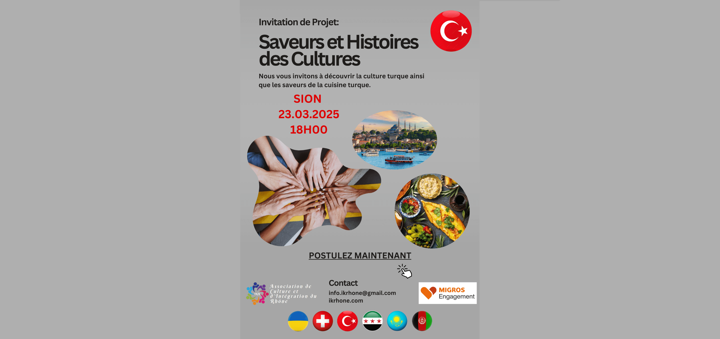 🏛 Nuit des Musées du Valais – 8 novembre 2025ActivitésLe Professeur Dr. Şerif Ali Tekalan en visite dans le ValaisActivitésFête des châtaignesActivités🌍 Retour sur notre Clean-Up Day 2025Activités{{title}}{{catlist_raw}}{{title}}{{catlist_raw}}🌍 Clean-Up Day 2025 avec IKRHONEActivités📚 Rentrée 2025-2026 : Une nouvelle année d’apprentissage commenceActivités📢Une formation à la rédaction de projets a été organisée à Sion par IKRhoneActivitésBienvenue à la nouvelle année scolaireActivités🇨🇭Joyeux 1er août !🇨🇭ActivitésSaveurs et Histoires des Cultures – AfghanistanActivitésSaveurs et Histoires des Cultures - UkraineActivitésEid al-Fitr, Événement Eid Al-FitrActivitésMatch de DémonstrationActivitésSoirée turco-afghane 25.03.2025ActivitésSaveurs et Histoires des CulturesActivitésFête de la ChâtaigneActivités{{title}}{{catlist_raw}}Prière pour les victimes du tremblement de terre lors de la Journée mondiale de prière en SuisseActivités, Nous dans la presse26 NOVEMBRE 2022 – TURQUIEActivités, Nous dans la presse{{title}}{{catlist_raw}}"Cuisiner ensemble, manger ensemble, être ensemble"ActivitésLa journée mondiale de prièreActivitésAppel aux dons pour les victimes du tremblement de terre en Turquie et en SyrieActivitésÉvénement Weihnachtstag à TurtmannActivités{{title}}{{catlist_raw}}Rencontres de parentsActivités{{title}}{{catlist_raw}}{{title}}{{catlist_raw}}CommissionsQui sommes-nous ?ActivitésAccueil